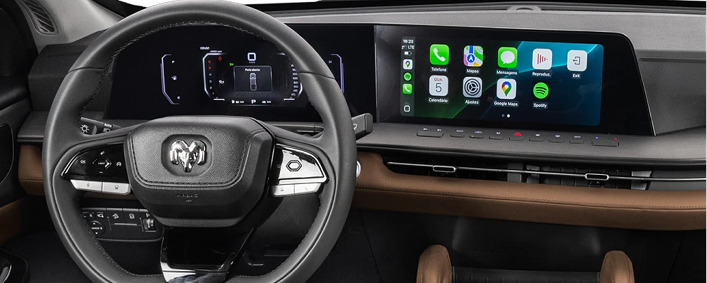 Quase 20” de telas integradas, combinando painel digital e central multimídia de 12,3”, com conectividade sem fio e recursos voltados tanto para o dia a dia quanto para o off-road.